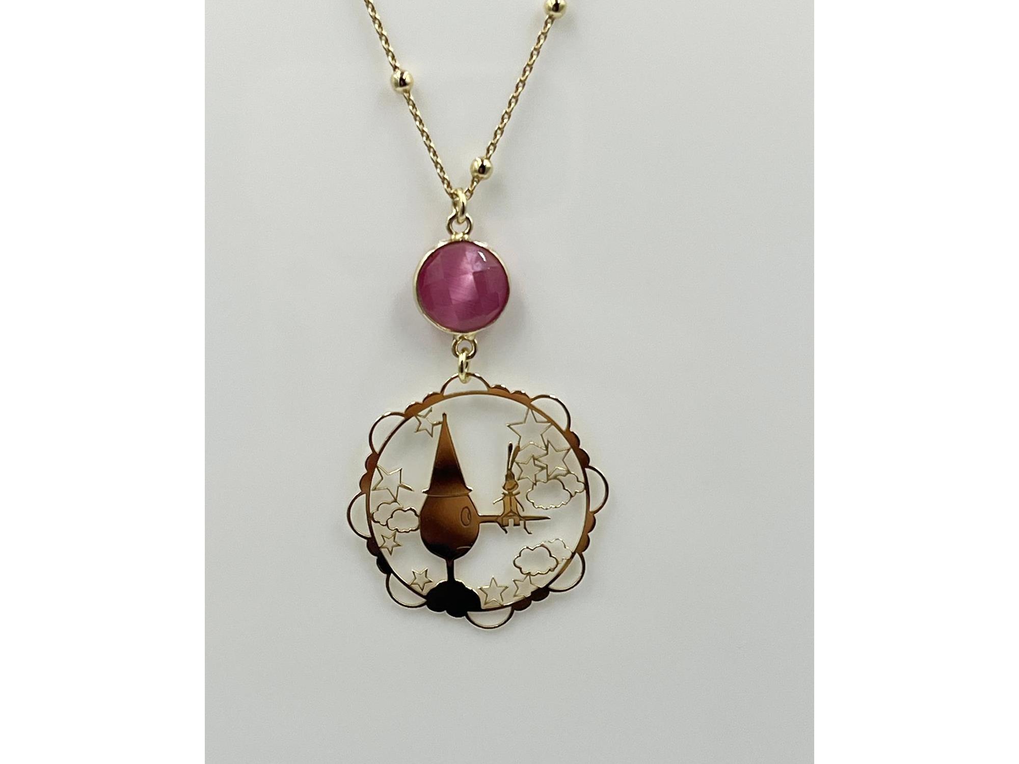 Collana con Pinocchio e Grillo Parlante sul naso. Incisa sul davanti, dietro liscio. Pietra idrotermale rosa. Ciondolo circa 3cmx3cm in lastra di 0,3 mm circa. Pietra circa 1.1 cm.