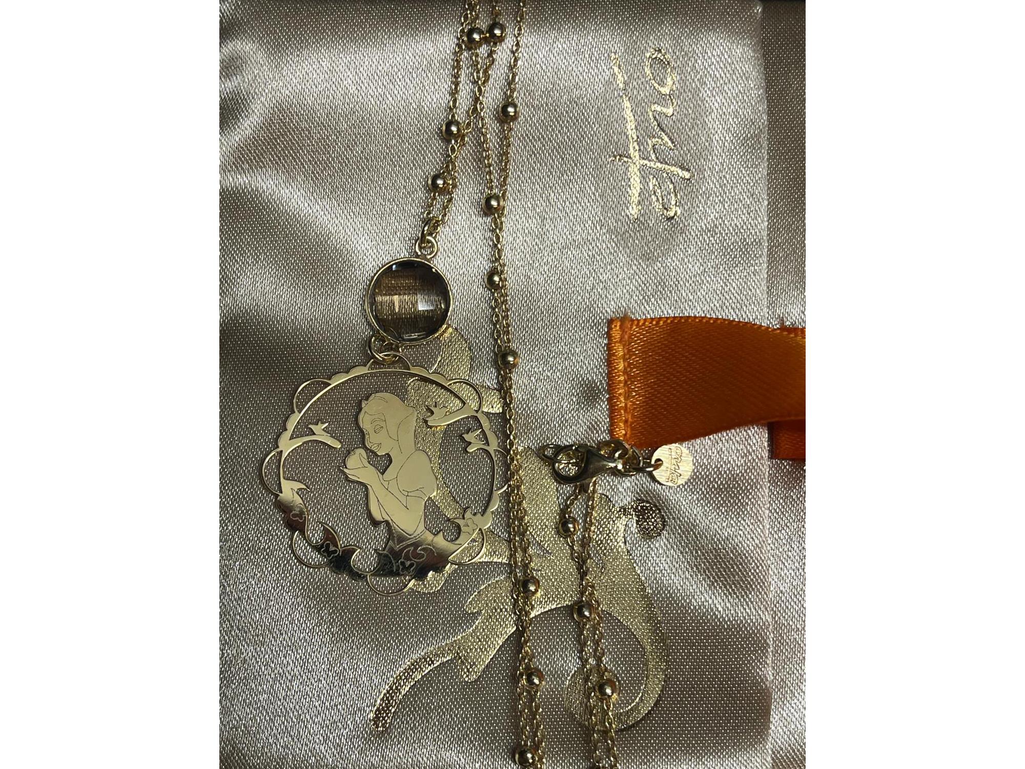 Collana con Biancaneve che tiene in mano la mela. Incisa sul davanti, dietro liscio. Pietra idrotermale fumè. Ciondolo circa 3cmx3cm in lastra di 0,3 mm circa. Pietra circa 1.1 cm.