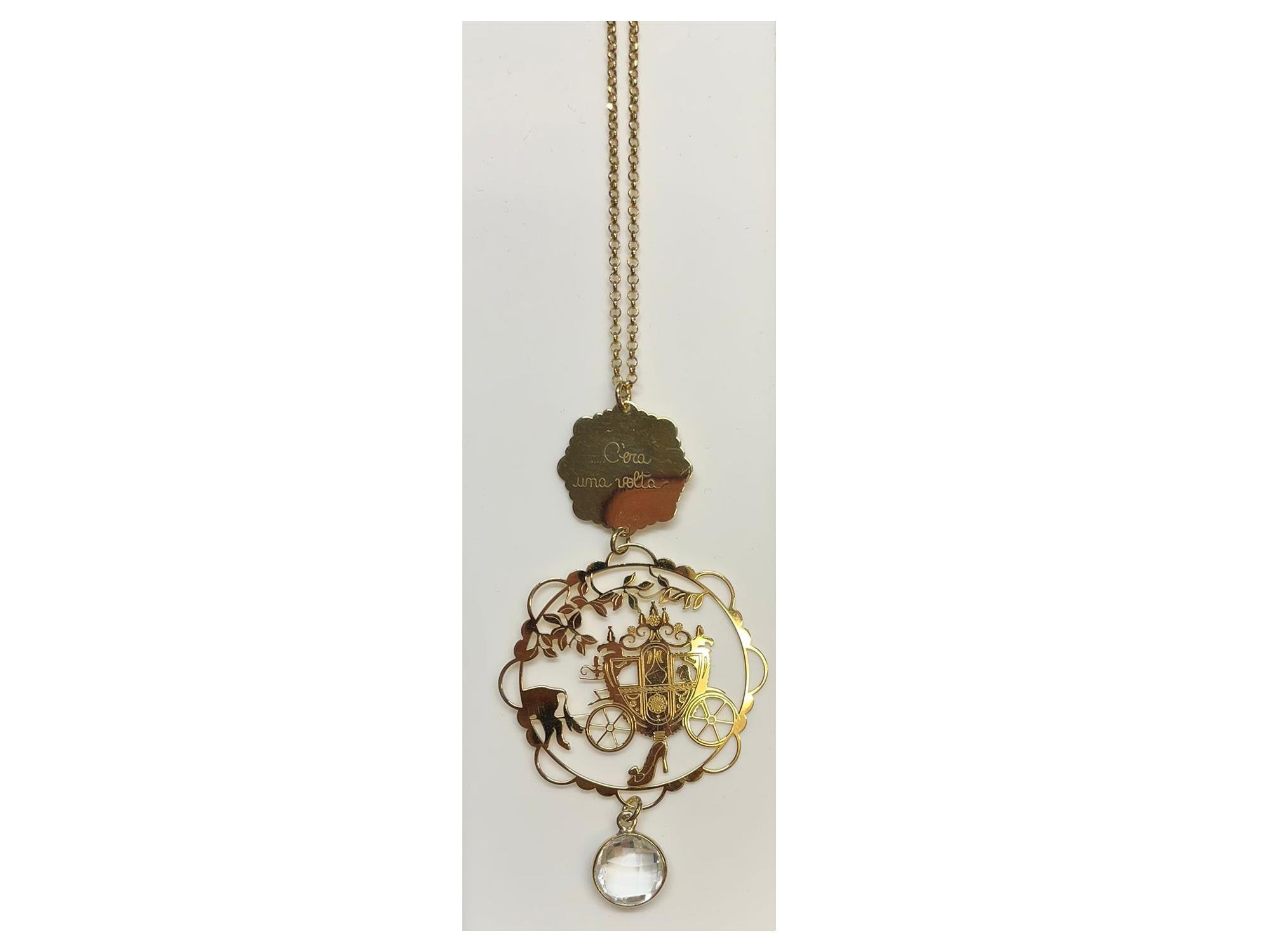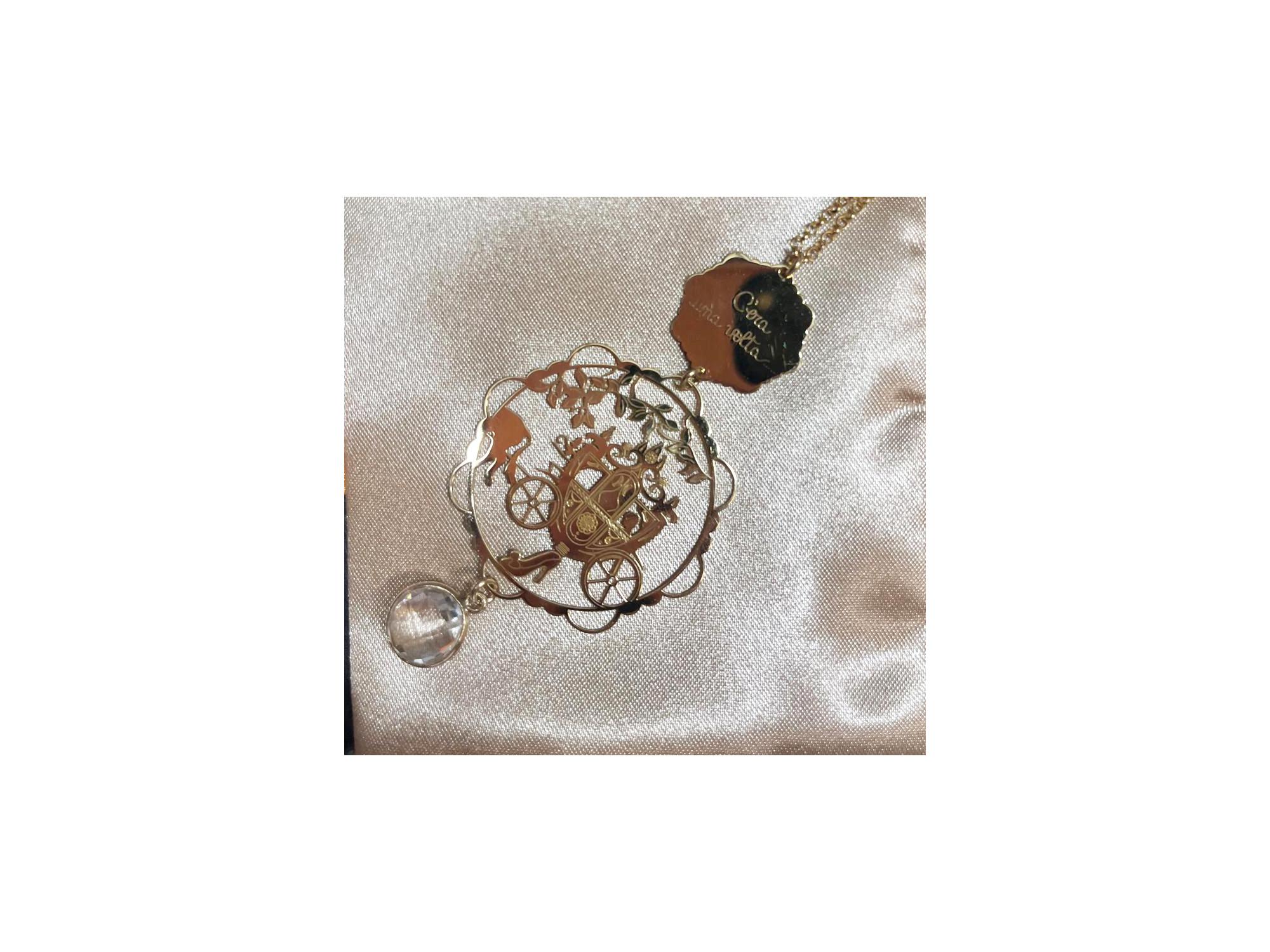 Pendente grande in tre pezzi. Nuvoletta circa 2 cmx2cm. Scena ritagliata con carrozza 4cmx4cm, davanti dettagli incisi, dietro liscia. Pendente con pietra idrotermale trasparente cm 1,1x1,1.