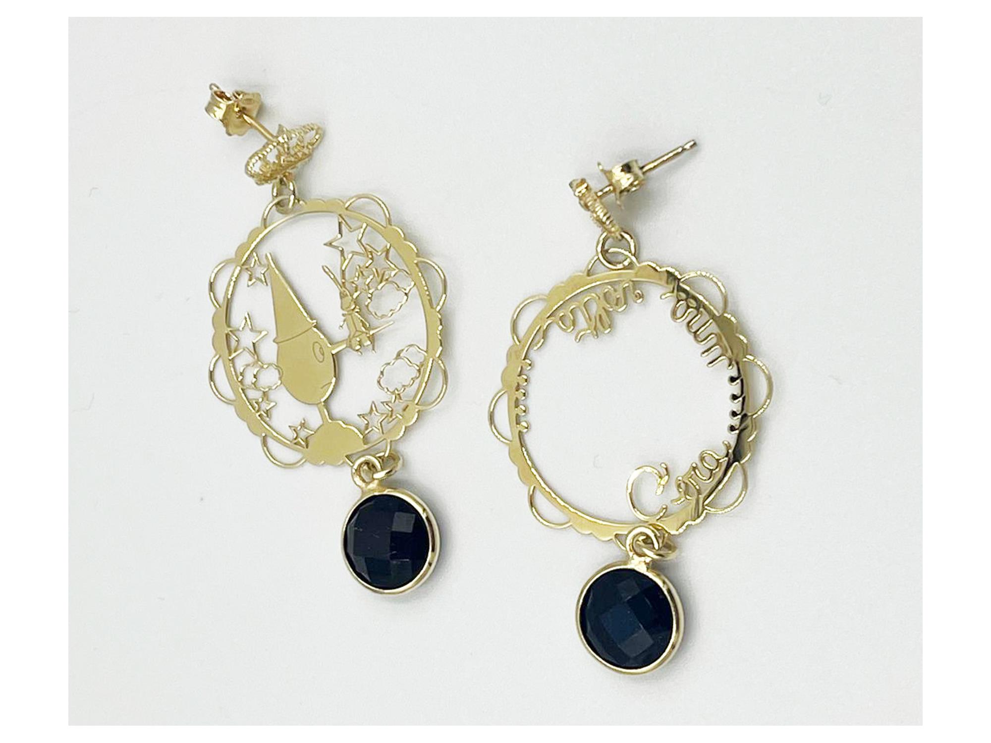 Orecchini in argento 925 dorato. Tappabuco fatto a corona cm 1x 7 mm. Lastra ritagliata, davanti incisa dietro liscia. Pinocchio con il grillo sul nasto. L'altro orecchino riporta la frase "C'era.... una volta". cm 3x3. Lastra spessore circa 0.30 mm. Pendente pietra idrotermale nero cm 1,1x1,1 circa.